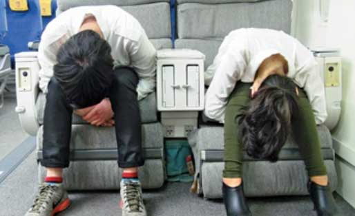 - 앞에 좌석이 있는 경우: 양손을 겹쳐 앞 좌석 등받이에 대고 그 위에 이마를 대고 숙입니다.