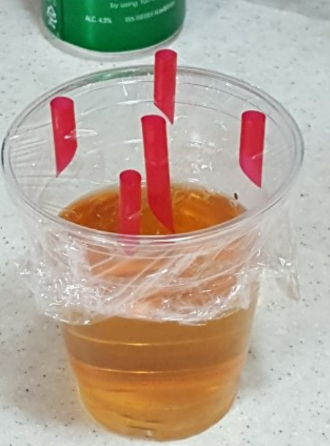- 초간단 날파리 트랩 – 빈 페트병에 사과식초와 설탕을 넣고 입구를 랩으로 덮은 후 작은 구멍을 뚫으면, 날파리가 안으로 들어가서 빠져나오지 못하는 구조예요.